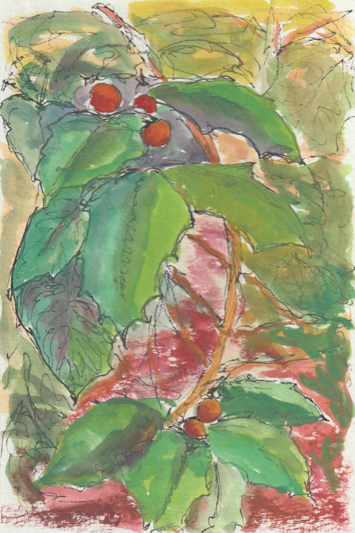 Painted “en plein air,” an American Holly with its bright red berries as seen on a woods walk at Lums Pond.