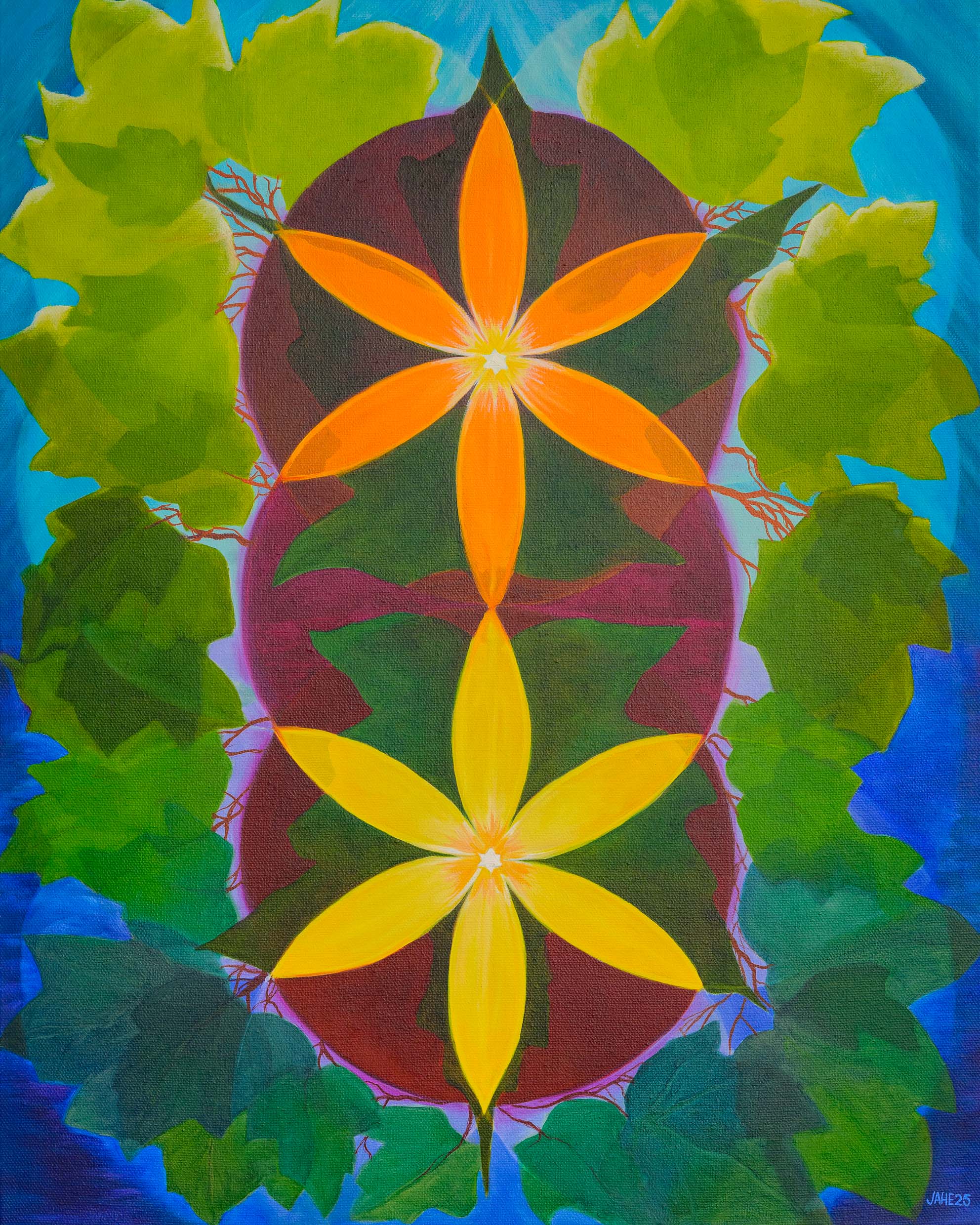 This painting of two radiating circular patterns within a woodland landscape tells the story of the seed of life expanding and multiplying into a sunlit and lush world.