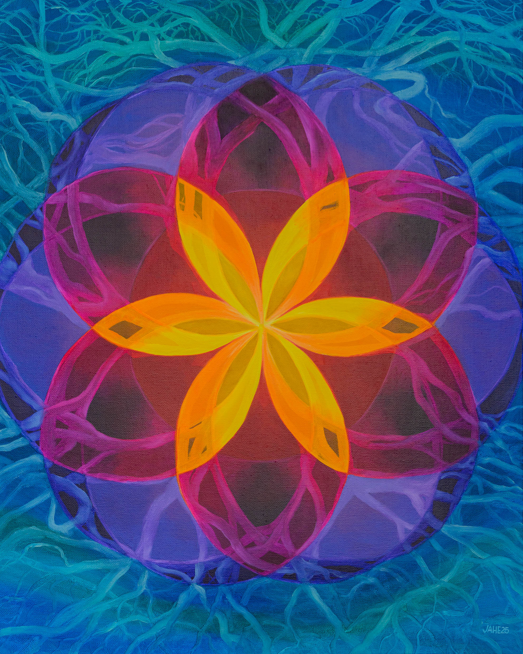 This painting of radiating pattern with yellow at the center surrounded by reds, purples, and blues features the two seed of life patterns overlapping and rotating to create new points of connection.