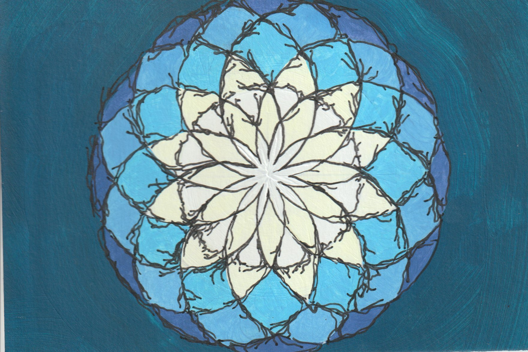 Overlapping circles to create a radiating 12 pointed star with the colors of pale moonlight and shadowy branches surrounded by soft blues.