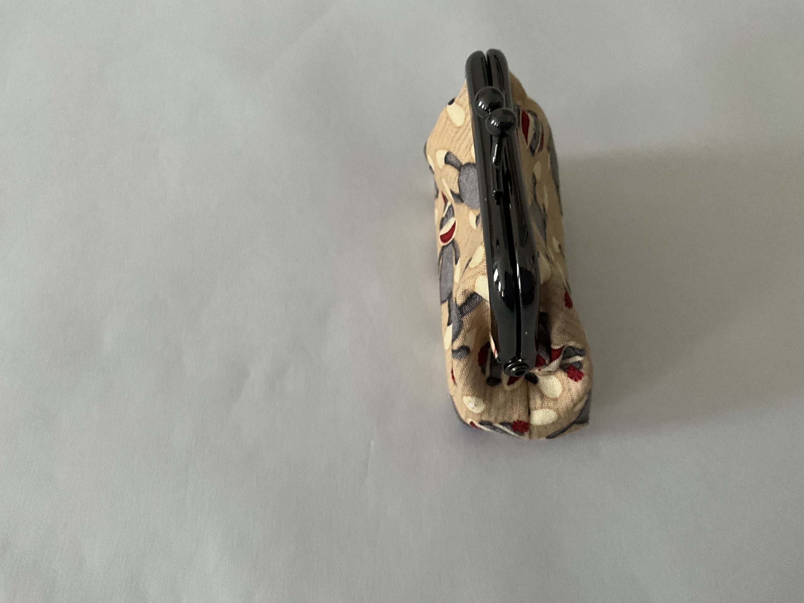 This adorable, case, made by me, is 100% durable pre-washed cotton. Can fit coins, earbuds (in their case), small hair clips, wrapped candies, small tins of mints, etc. approximately 3 1/2” wide by 2 1/2” tall. Hand washable if needed, air dry. Fully lined in coordinating fabric. Main colors are tan, grey and red.